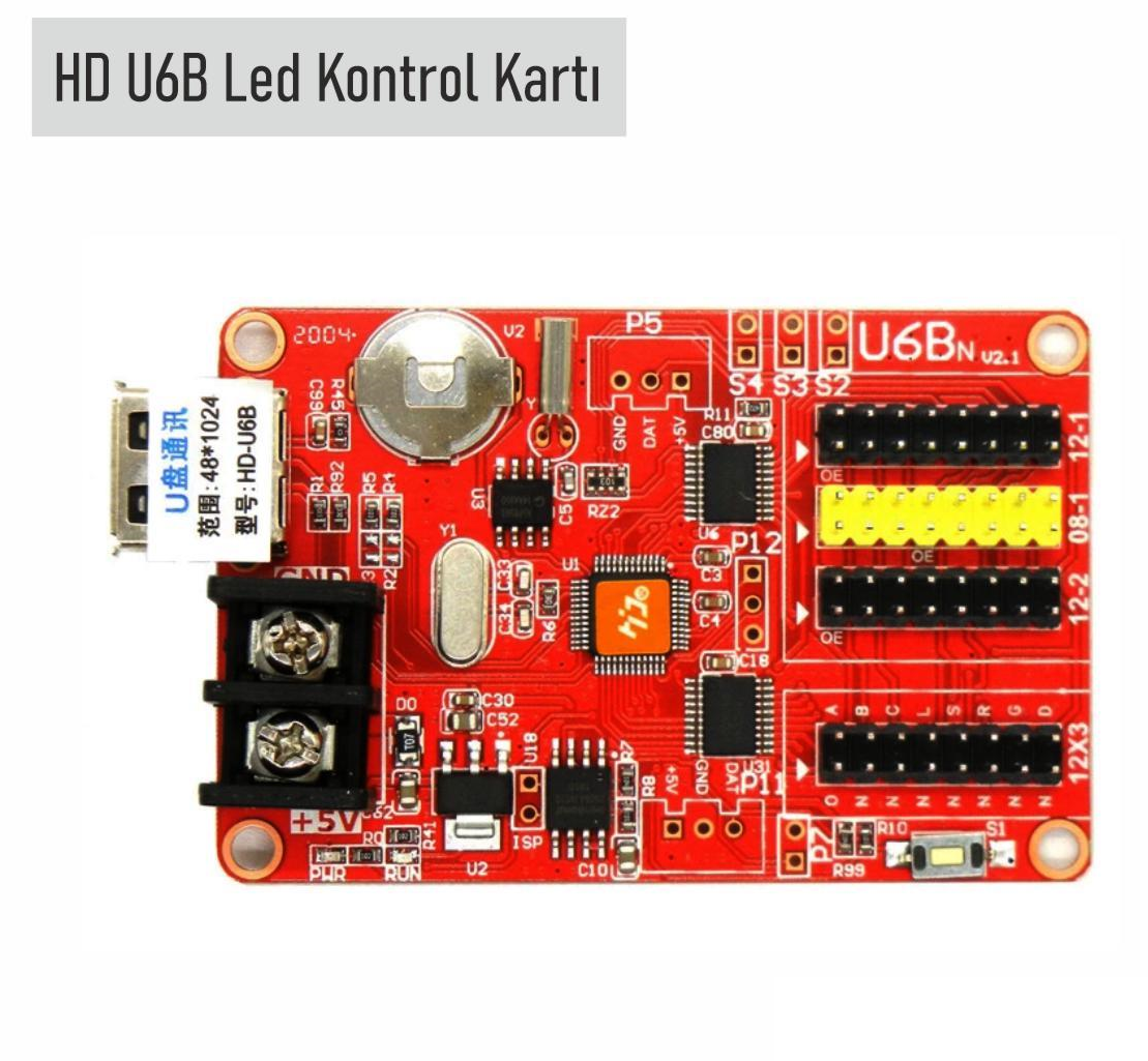 Led tabela kayan yazı sistemlerinde çok sık kullanılmakta olan HD-U6B Led Kontrol Kartı ile 48×2014 ölçülerinde ki led tabela kayan yazıları rahatlıkla programlayabilirsiniz. HD 2018-2020 programı ile kontrol edilen HD-U6B Led Kontrol Kartı sayesinde saat,tarih ,hareketli gif,logo ve jpeg dosyası ekleyip,50 farklı animasyon kullanabilirsiniz.