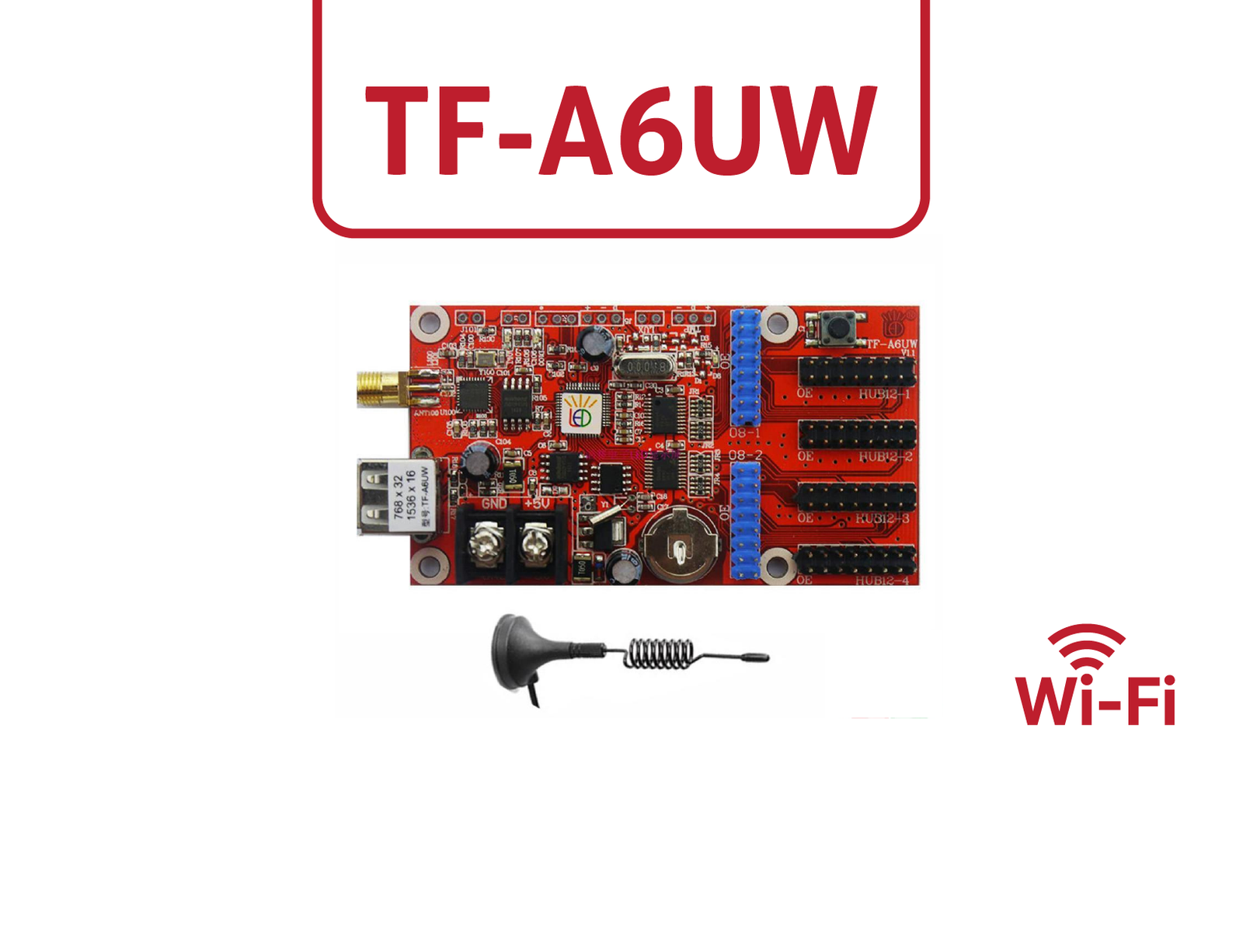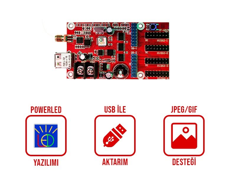 Led tabela kayan yazı sistemlerinde çok sık kullanılmakta olan TF-A6UW Led Kontrol Kartı ile 768×32 ve 384×64 ölçülerinde ki led tabela kayan yazıları rahatlıkla programlayabilir ve Wifi ile bağlantı sağlayabilirsiniz. PowerLed programı ile kontrol edilen TF-A6UW Led Kontrol Kartı sayesinde saat,tarih ,hareketli gif,logo ve jpeg dosyası ekleyip,50 farklı animasyon kullanabilirsiniz.